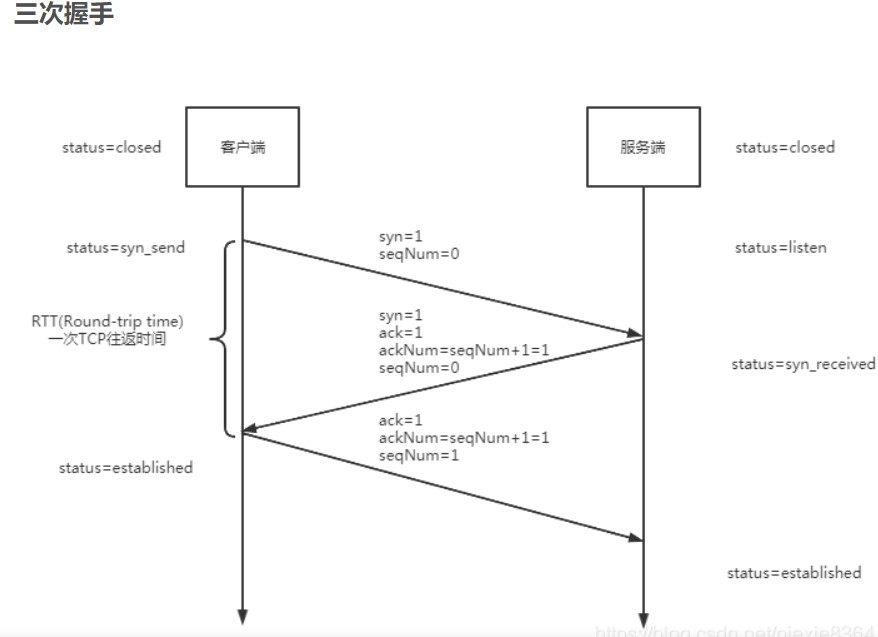 第一次握手:客户端发送一个SYN请求报文,设置随机序列号为seq=x,并进入SYN_SENT(请求连接)状态。
