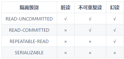 SERIALIZABLE(可串行化): 最高的隔离级别,完全服从 ACID 的隔离级别。所有的事务依次逐个执行,这样事务之间就完全不可能产生干扰,也就是说,该级别可以防止脏读、不可重复读以及幻读。